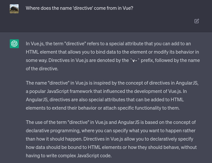 Chat GPT는 Vue의 디렉티브가 Angular의 디렉티브에 영감을 받았다고 한다. 처음엔 믿기 어려웠지만, v-if